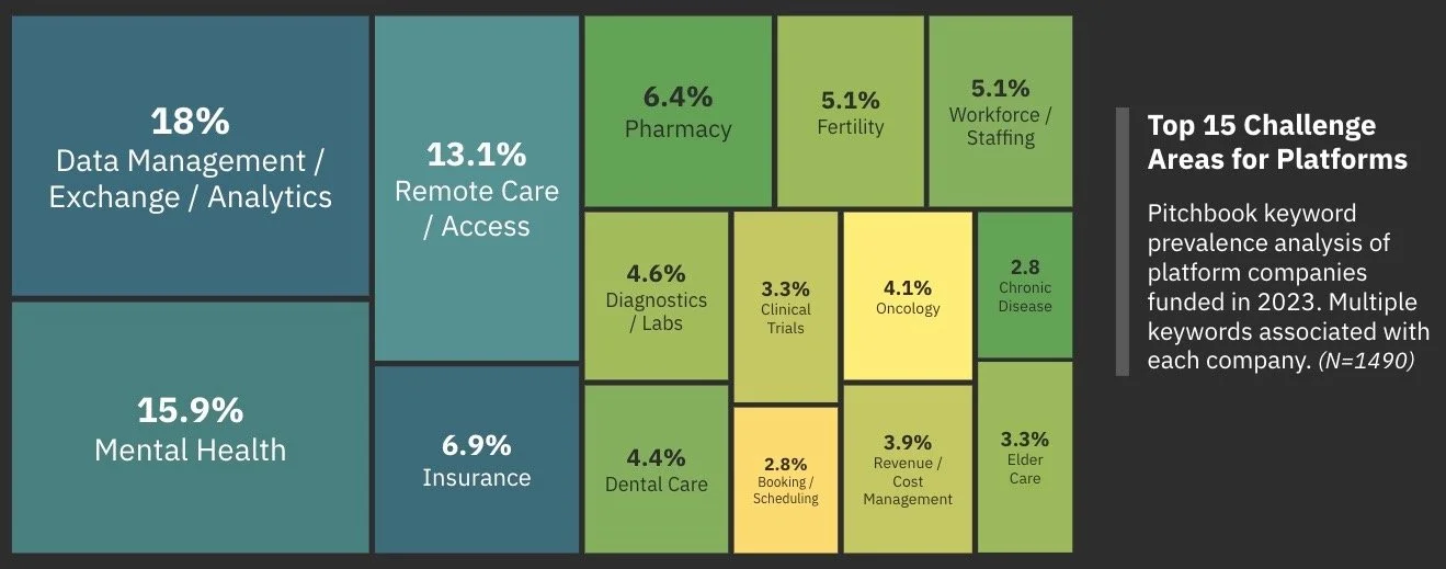 This last year saw platform companies raise capital to tackle some of the most pressing and complex healthcare challenges, with nearly half of companies dedicated, to some degree, towards addressing access to care, mental health, and data management/exchange.
